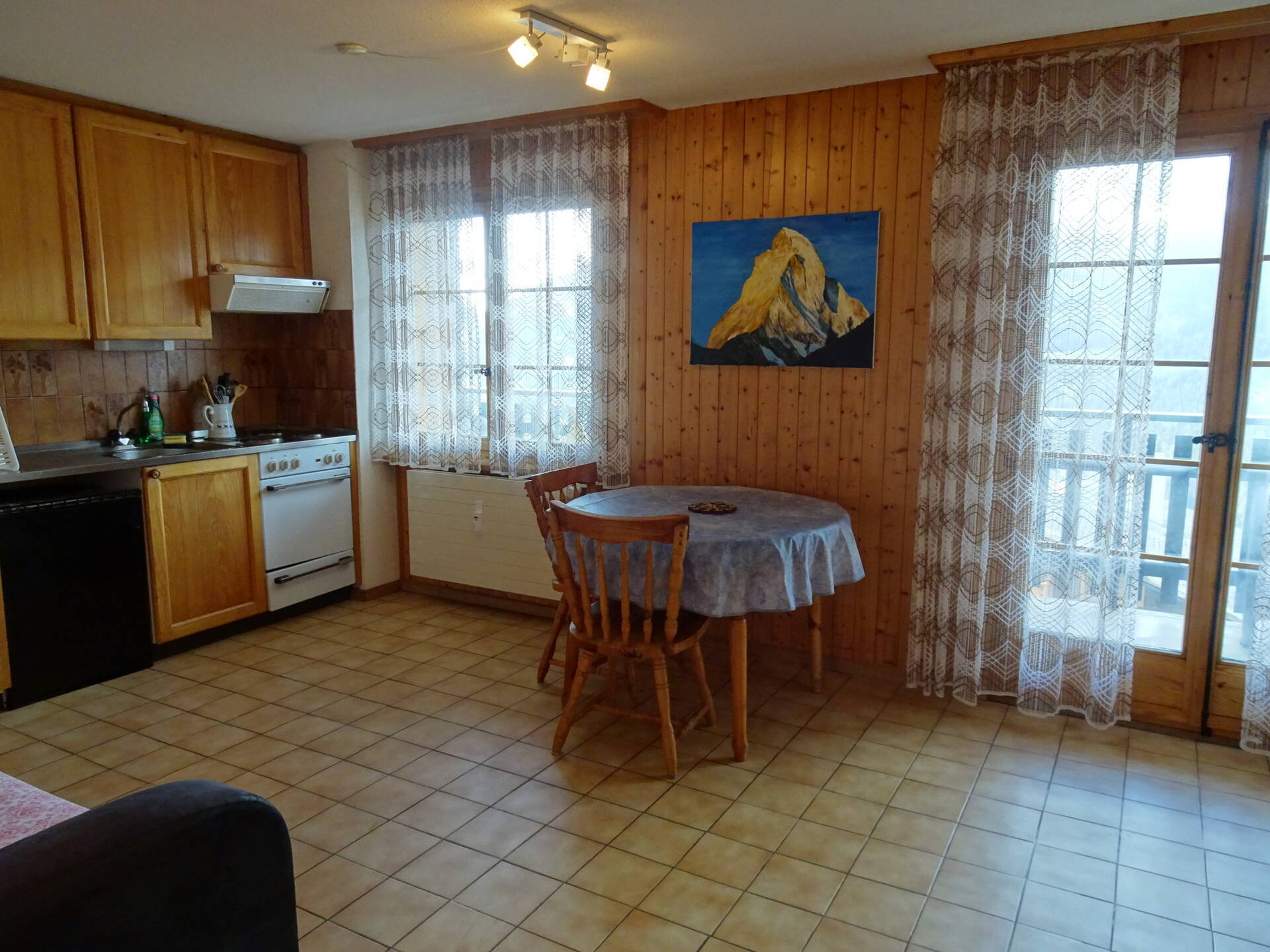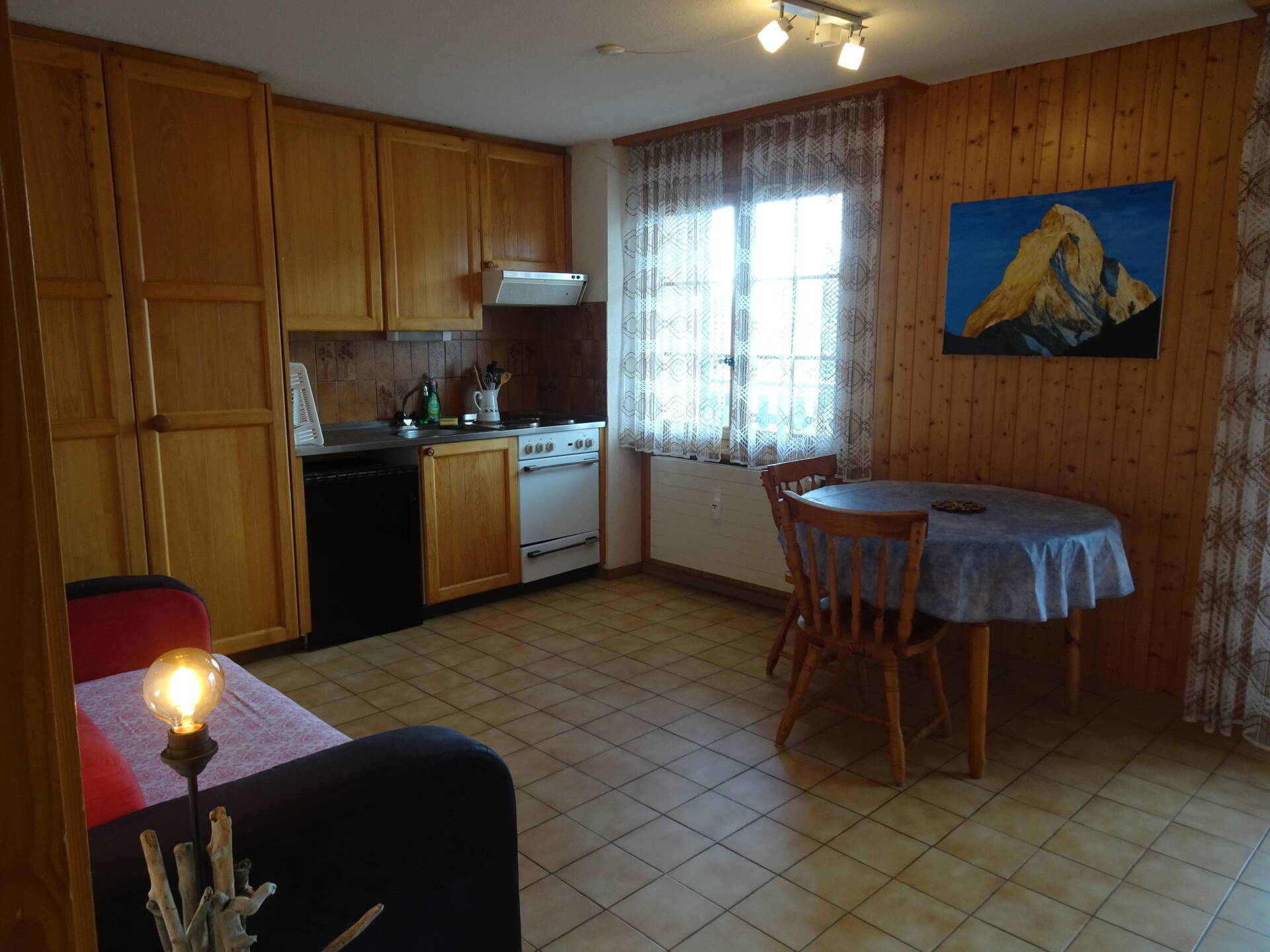 Cuisine : ouverte, cuisinière électrique, four, réfrigérateur, vaisselle à double, set fondue et raclette sur demande